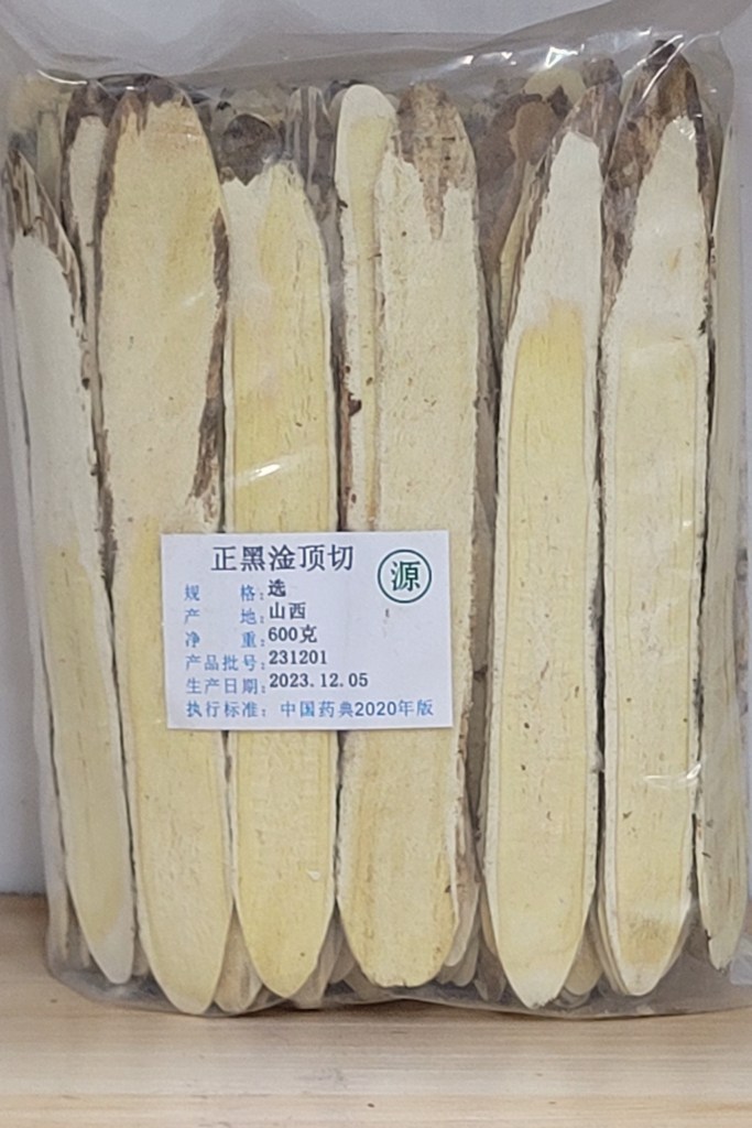以上為黃芪藥材飲片切片,皮部呈白色,木部呈黃色