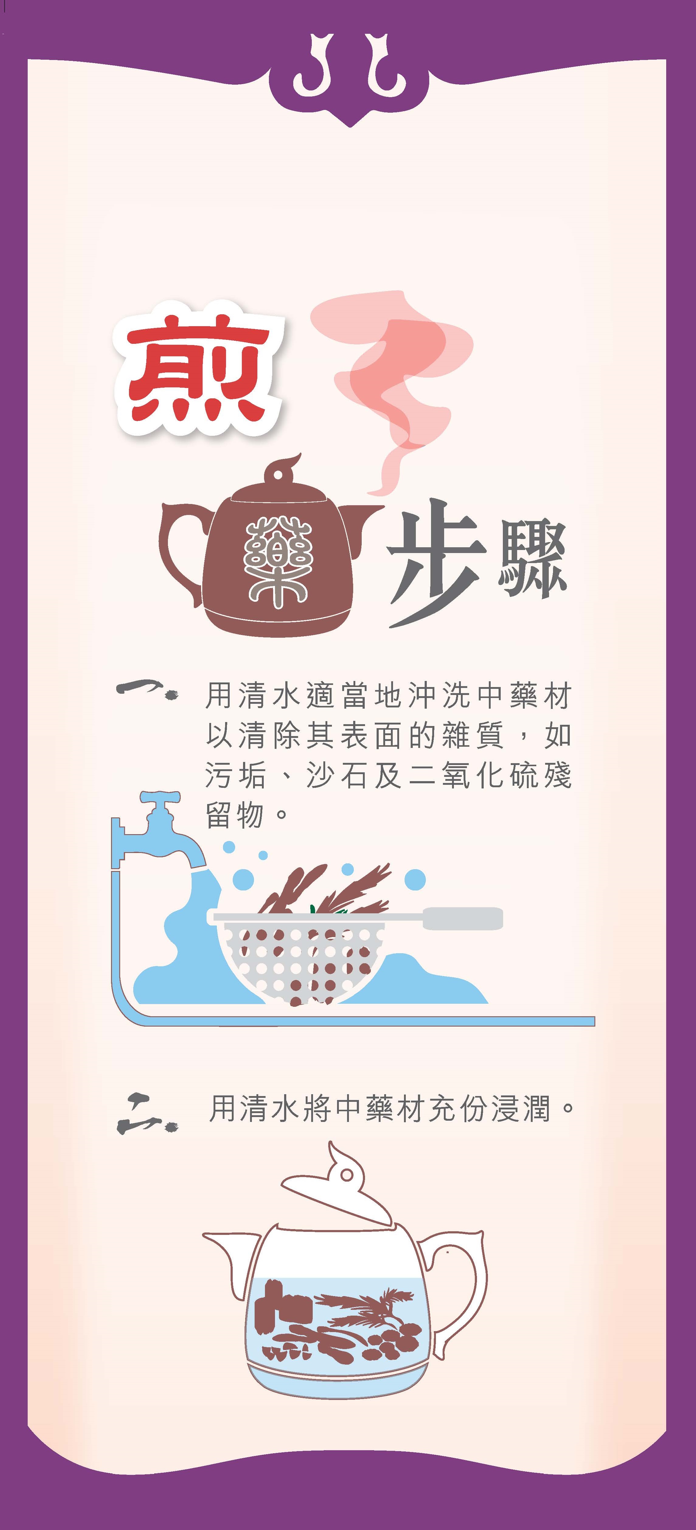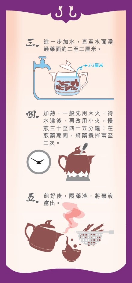 - 以上為煎煮中藥的一般程序建議,具體的煎藥方法會因應個別中藥的藥性或患者的病情需要而有所不同,使用時請以中醫師的指示煎煮中藥。